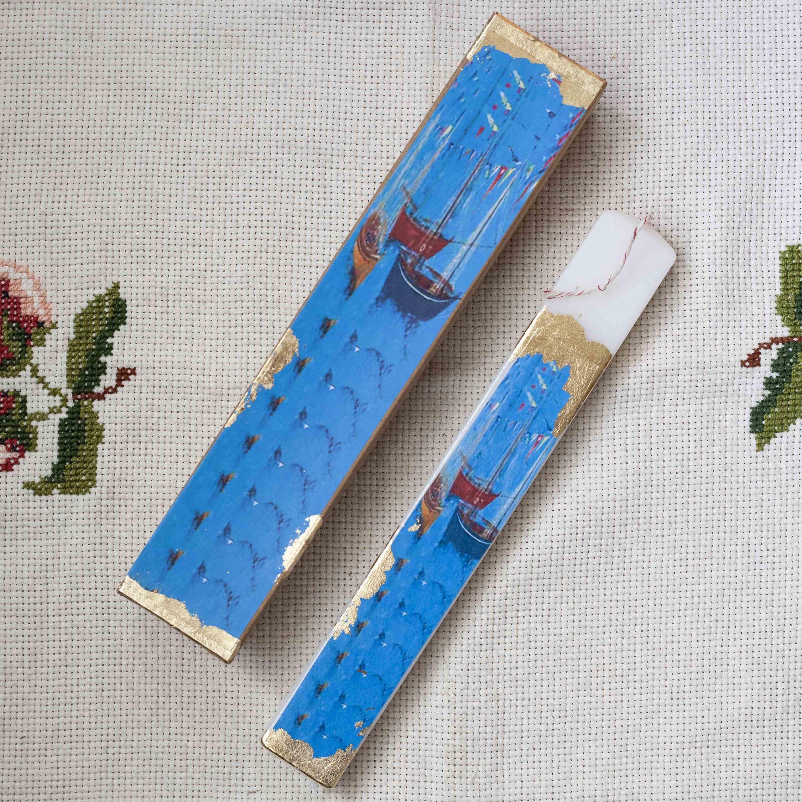 Αρωματική Πασχαλινή Λαμπάδα με Γαλάζιο Μοτίβο με Καράβι σε Διακοσμητικό Κουτί