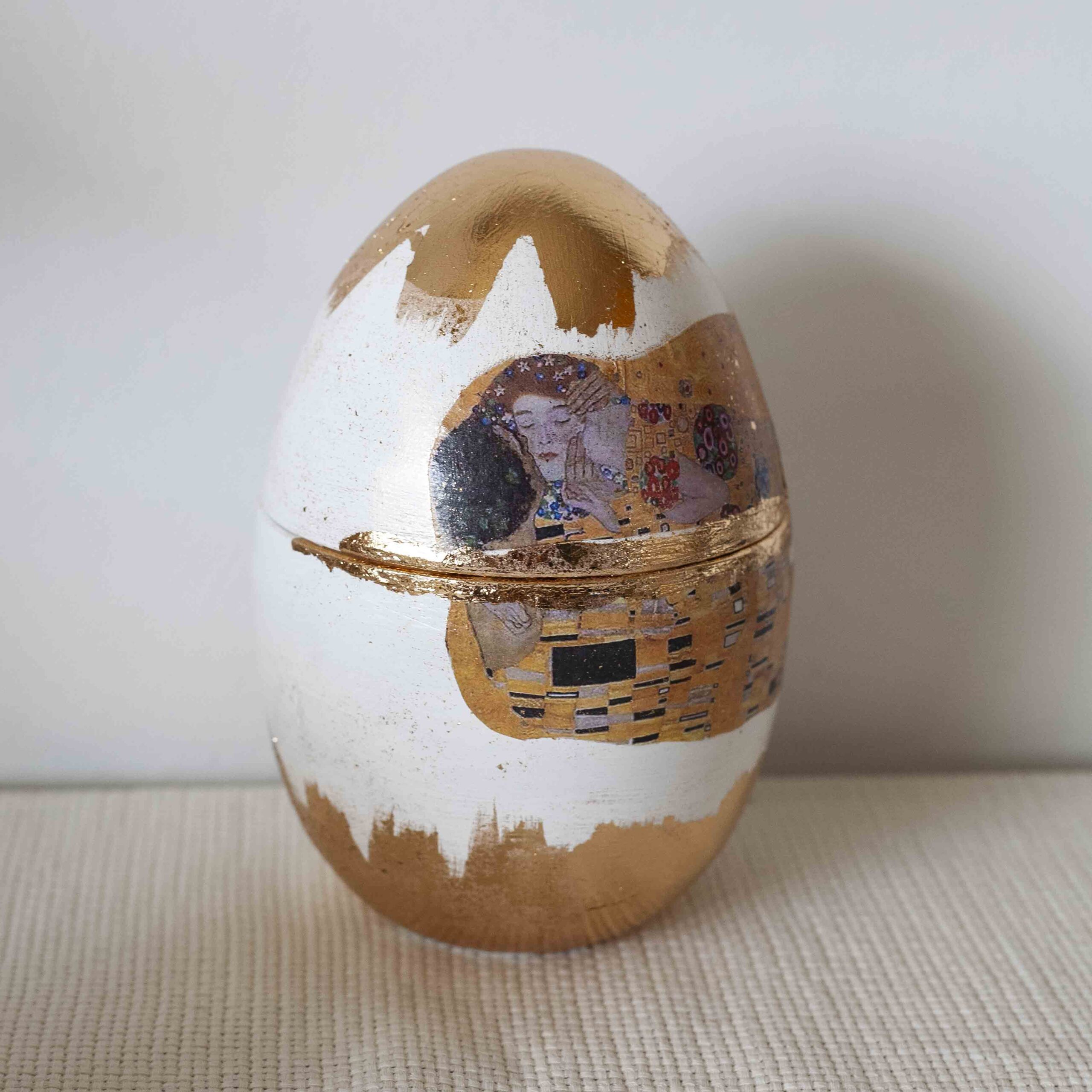 Καλλιτεχνικό διακοσμητικό αυγό εμπνευσμένο από το εμβληματικό έργο «Το Φιλί». Οι θερμές αποχρώσεις και τα στοιχεία φύλλου χρυσού δημιουργούν ένα αποτέλεσμα γεμάτο ρομαντισμό και ένταση. Ιδανικό για λάτρεις της τέχνης και για ξεχωριστή πασχαλινή διακόσμηση.