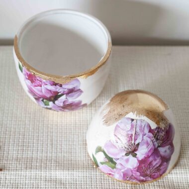 Ρομαντικό χειροποίητο διακοσμητικό αυγό με εντυπωσιακή σύνθεση από ροζ ανθισμένα λουλούδια. Η διακριτική χρήση φύλλου χρυσού προσθέτει λάμψη και πολυτέλεια, δημιουργώντας ένα κομψό αποτέλεσμα που ξεχωρίζει. Ιδανικό για πασχαλινή διακόσμηση, ανοιξιάτικες συνθέσεις ή ως ιδιαίτερο δώρο.