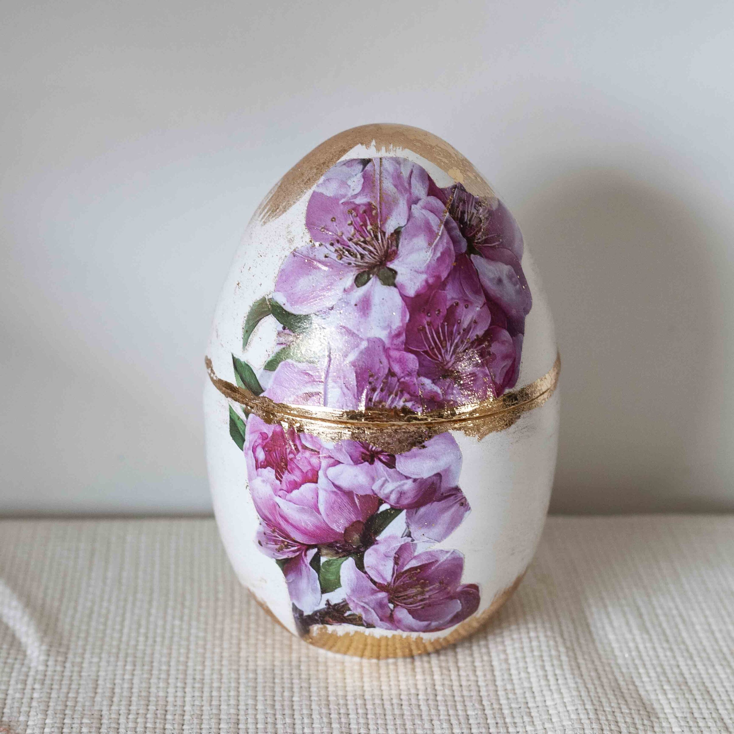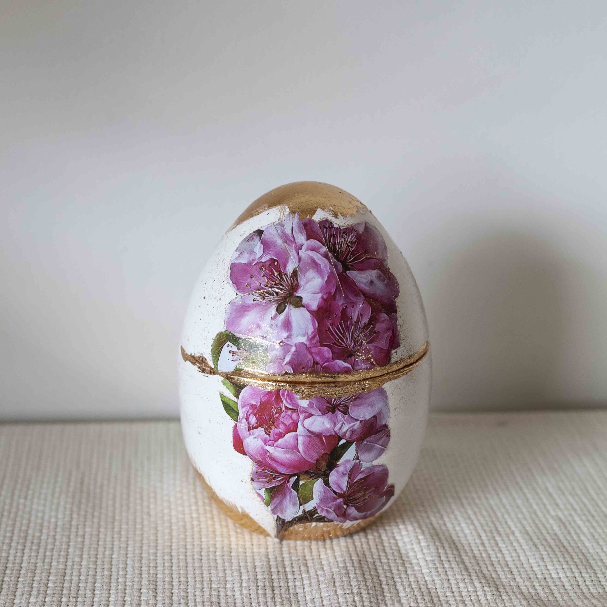 Ρομαντικό χειροποίητο διακοσμητικό αυγό με εντυπωσιακή σύνθεση από ροζ ανθισμένα λουλούδια. Η διακριτική χρήση φύλλου χρυσού προσθέτει λάμψη και πολυτέλεια, δημιουργώντας ένα κομψό αποτέλεσμα που ξεχωρίζει. Ιδανικό για πασχαλινή διακόσμηση, ανοιξιάτικες συνθέσεις ή ως ιδιαίτερο δώρο.