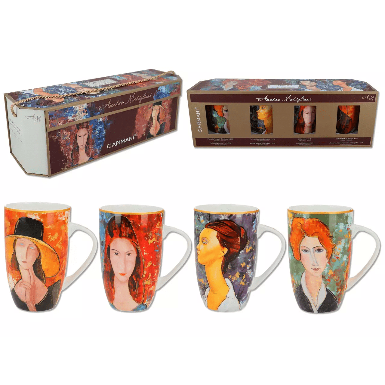 Αυτό το κομψό σετ περιέχει 4 πορσελάνινες κούπες με δημοφιλή έργα του Ιταλού ζωγράφου Amedeo Modigliani. Κάθε κούπα χωράει 380 ml, κάνοντας τις στιγμές καφέ ή τσαγιού μια στυλάτη και καλλιτεχνική εμπειρία. ιδανικό για δώρο.