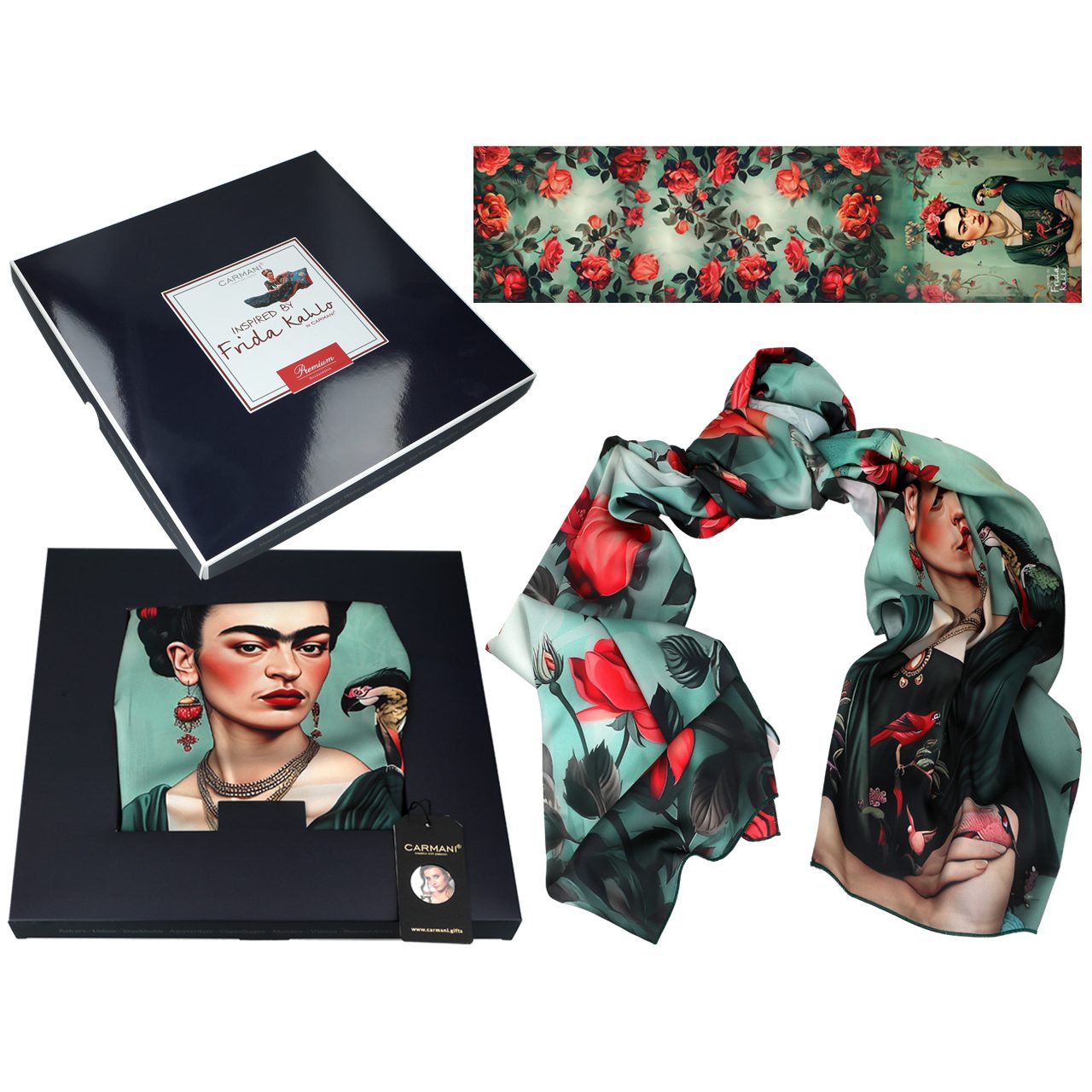 Κομψή και εκφραστική εσάρπα από τη συλλογή CARMANI, εμπνευσμένη από τον μοναδικό καλλιτεχνικό κόσμο της Frida Kahlo. Είναι κατασκευασμένη από καινοτόμο πολυτελές ύφασμα tamina, που επιτρέπει εντυπωσιακά σχέδια με μεταξένια υφή. Ελαφριά και απαλή, μπορεί να φορεθεί ως εσάρπα ή ως φουλάρι, προσθέτοντας καλλιτεχνικό χαρακτήρα σε κάθε εμφάνιση. Ιδανική για γυναίκες που αγαπούν το δυναμικό και ξεχωριστό στυλ.